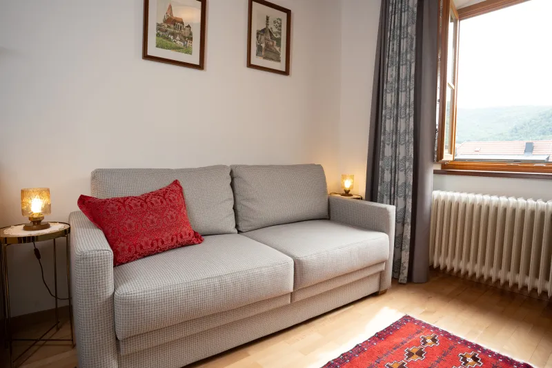 Unsere Ferienwohnung ist mit zwei getrennten Schlafräumen (je zwei Personen), Bad / Dusche, WC, Haarföhn, Waschmaschine, SAT-TV und einer großzügigen Küche ausgestattet. Außerdem sind Bettwäsche und Handtücher vorhanden. Bei Ihrer Ankunft finden Sie als Willkommensgeschenk Milch, Butter und eine hausgemachte Marillenmarmelade in der Küche vor.